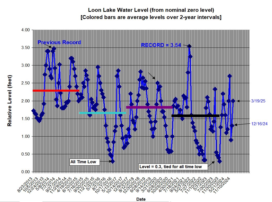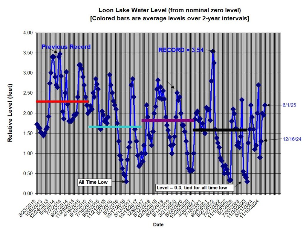 The lake depends on snow and rain (and some springs) to keep the water level up. The red line is the lake level average from 8/13 to 8/15 in feet from an arbitrary starting point of 0 feet. The cyan line is the lake level average from 8/15 to 8/18. The magenta line is the average lake level from the 8/18 to 8/20. The black line is the average lake level from 9/19 to 9/21. On 11/9/20 the level was at 0.58 feet. The minimum recorded level over the period from 8/23/13 (when we started measuring) until now was 0.3 feet. The maximum level recorded was 3.54 feet on on 10/31/21 (see arrow) – which is a new high since we have been keeping track beginning 8/23/13! We went from that record high to tying the low record of 0.3 feet. As of 10/23/2023 the level is at 0.4 feet – approaching the all-time low. (One caveate: we changed the measuring location from John’s dock to the notch on his permanent deck, so measurements could be slightly off).