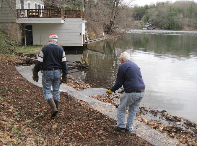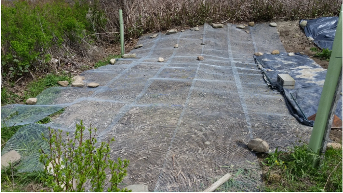 Volunteer have removed dry growth and emerging buds on a large pilot patch at Serenity Cove. The area was than covered with metal mesh and any green material carefully destroyed. The shoots will grow through the ½’ holes and be strangled. This prevents nourishment from getting to the rhizome root system ‘starving’ the plant while killing the shoots. The mesh will need to be in place for a few years to eliminate the plant. Volunteers will monitor, taking pictures and observing the results.