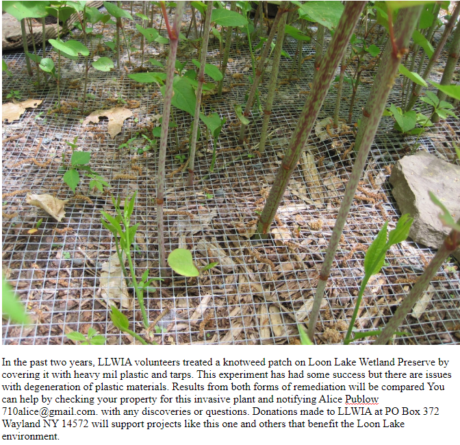 Japanese Knotweed is called the Godzilla weed because it is so hard to defeat. This non-native bamboo is creeping its way around Loon Lake’s waterfront, destroying the precious natural habitat. Loon Lake Watershed Improvement Alliance (LLWIA) and Finger Lakes Partnership for Regional Invasive Species Management (PRISM) have joined in a pilot project designed to halt the progress.